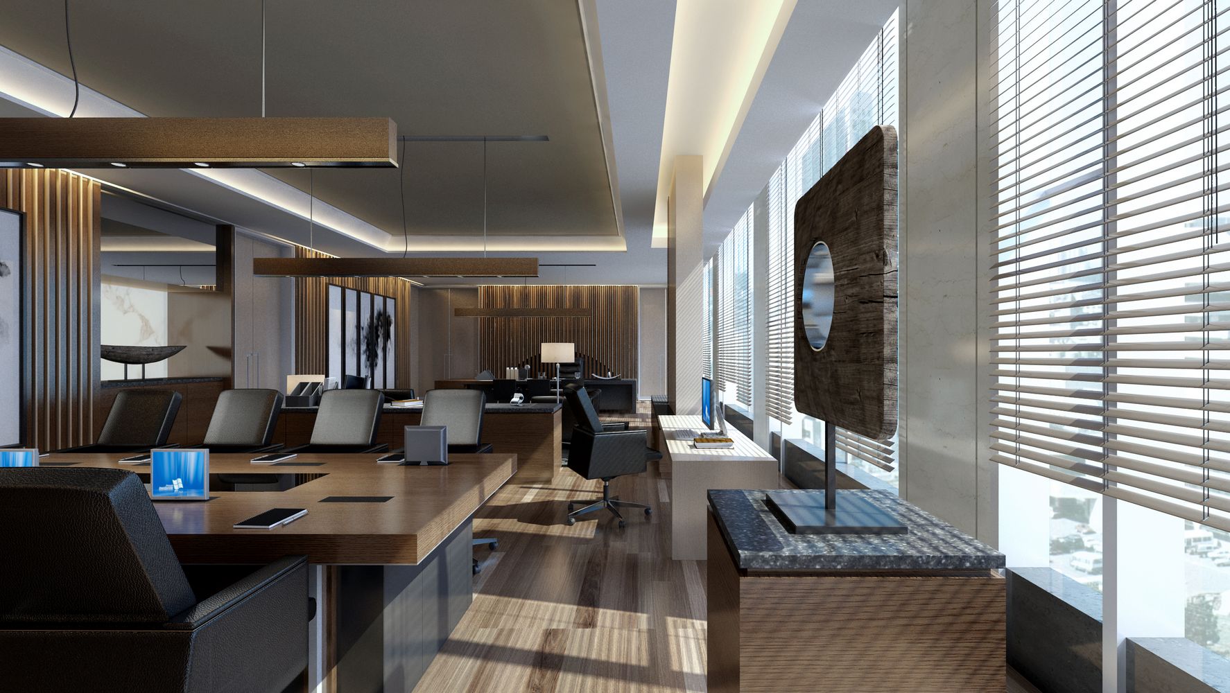 传统型的办公室稳重凝练,这种类型的办公室一般是比较传统老牌公司,这样的风格设计给人的感觉比较放心,树立企业的公信力和传达出公司实力;这样的办公室装修色差不是很大,造型上比较保守,方方正正,材料的选择也比较讲究,强调气质的高贵和气派。