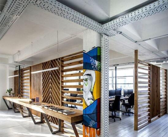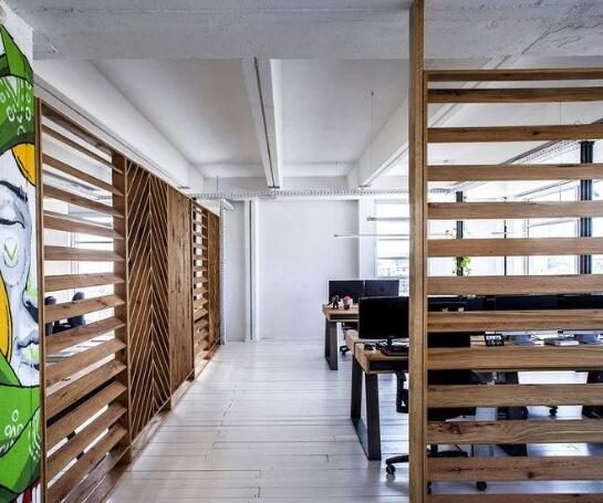 这些平时看起来碍眼的事物瞬间变得可爱起来,用斜纹的木质隔断一方面保证了员工的隐私一方面保留了良好的采光,创造属于自己的办公室文化。