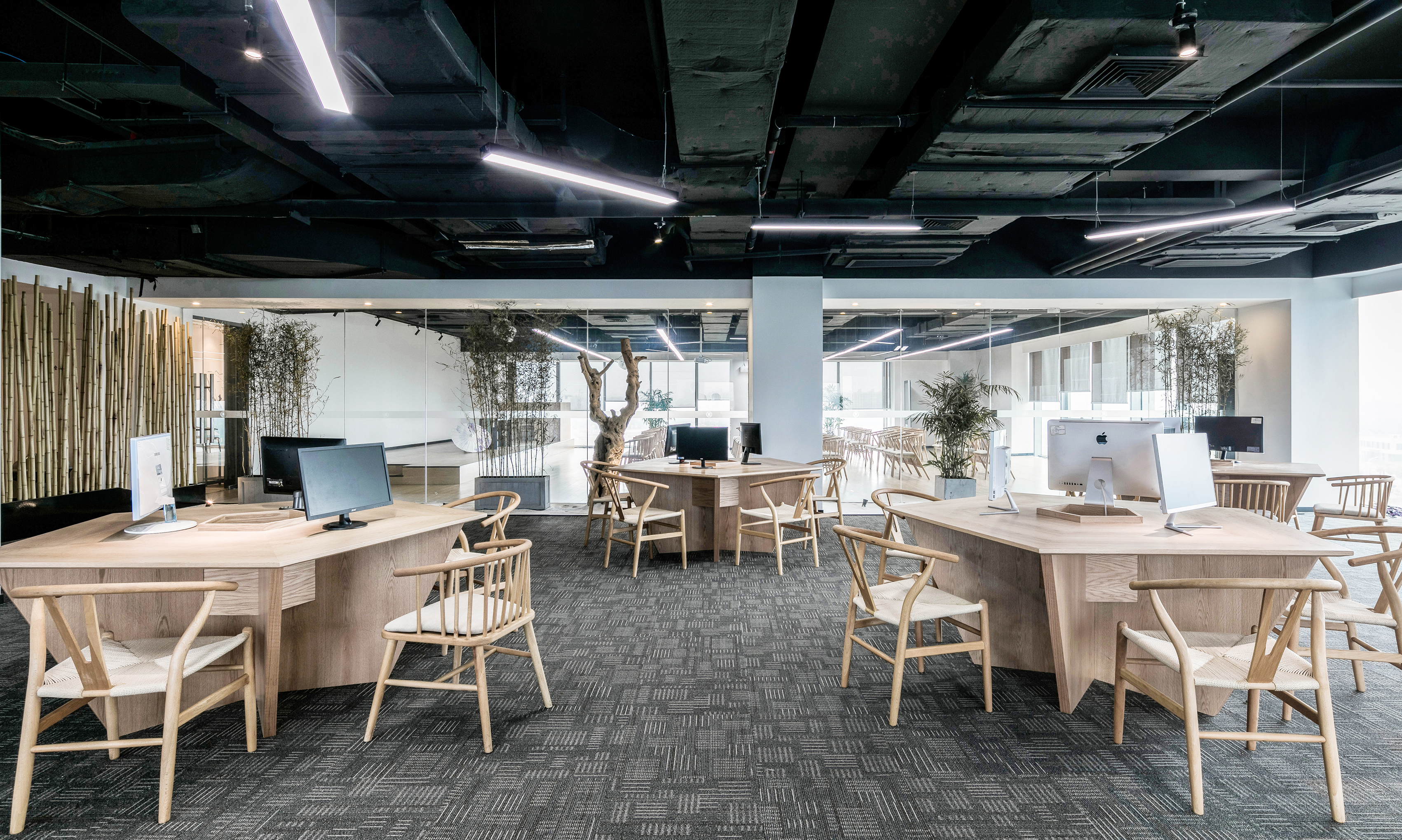 也没有大红大绿那么有冲击力,而是采用深蓝色的地毯、原木色的办公桌,鲜活的绿植来搭配,来打造舒适、和谐的办公场所。